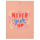 Make a bold statement with this vibrant, motivational design! Never Give Up is powerfully rendered in striking red and blue, standing out against a warm brown background that radiates resilience. Decorative leaves and small geometric shapes elegantly frame the message, adding a touch of sophistication. Bright purple and yellow accents bring a lively pop of colour, enhancing the positive energy and reminding you to keep pushing forward with strength and style. Perfect for those who need a daily dose of encouragement, this design inspires confidence and determination!
