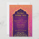 Bollywood or Arabian Nights theme birthday party invitation card in orange, magenta, and purple ombre with gold foil accents.