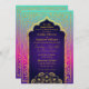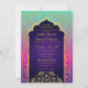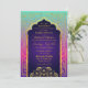 Bollywood or Arabian Nights theme wedding invitation card in purple, hot pink, and aqua ombre with gold foil accents.