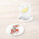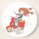 A bon voyage coaster starring Chapel Smith a cute, redhead girl who travels the globe driving a red vespa or motorcycle with a yellow seat, a cup of coffee in her right hand with steam rising from it, while her left hand is driving the vespa, wearing sunglasses and a red scarf blowing behind her in the wind as she drives along on her travels around the world and the globe. A perfect bon voyage gift for anyone going a trip to a city, country, anywhere in the world or globe, or everywhere.