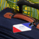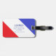 Luggage tag with a flying saucer and text|"Bon Voyage" that can be personalised. This flying saucer has blue white and red stripes as a background. Stand out from the crowd with this lovely next generation lugagge tag.
