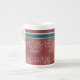 An elegant bone china Coffee Mug, with a formalised floral pattern and deckchair stripes in beige and dark blue on a rich burgundy background.