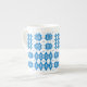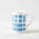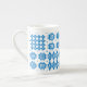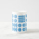A chic Bone China Coffee Mug, with a pattern of traditional Welsh Tapestry motifs in Bright Blue on a White background. This pattern will fit all Mug sizes.