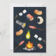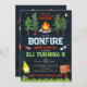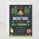 Invite your friends to a bonfire to celebrate your birthday with these adorable woodsy themed invitations featuring wooded trees, a bonfire, grass, lantern, and all the cookout essentials like hot dogs and s'mores.