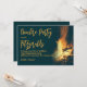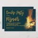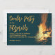 Backyard bonfire party invitation template. A burning fire design with very dark blue background and yellow-orange text. Party title and name / location text is large script. This horizontal invitation is perfect for a casual gathering with friends or to celebrate a birthday.