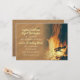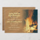 Bonfire wedding shower / engagement party invitations with realistic burning fire design. Sand photography is the background for text which is in casual, tall printed font. Names of the couple and party type are in bold script and all text is light yellow. A large “and” sign holds the names and acts as a shadow behind the wording. The bonfire is to the right of the text. The back of the card has an all-over sand image. Choose any paper upgrade to enhance this design.