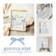 Featuring soft dusty blue tones, blue bows, and graceful script, this design pairs perfectly with any Parisian or coquette-themed celebration.
