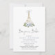 Bonjour Bebe Paris French Blue Eiffel Baby Shower Invitation features golden Eiffel Tower with blue bow on top and blue flowers with greenery. Back of invitation features baby blue stripes.