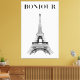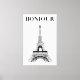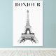 his elegant stretched canvas print features a classic black and white sketch of the iconic Eiffel Tower, paired with the stylish French greeting "Bonjour." Perfect for adding a touch of Parisian charm to any room. The minimalist design and timeless appeal make it a versatile piece that complements various home decor styles.