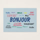 Bonjour Hello Languages World Travel Colourful design, saying hello in many different languages. Front design: Hello in the following languages: Brazilian Portuguese, Chinese, Dutch, English, French, German, Hausa, Igbo, Italian, Jamaican Patois, Japanese, Korean, Norwegian, Spanish, Swedish, Thai, and Yoruba. Room to add "hello" in other languages above and below, to substitute languages and/or move them around. Back design: Templates for business contact information, including company name, name, job title, phone, email, and professional contact.