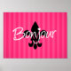 The word "Bonjour", with the "j" dotted with a heart, is on a black fleur-de-lis silhouette set against a background pattern of dark and lighter pink stripes.