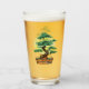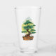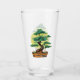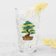 traditional watercolor design of a japanese bonsai tree in front of bright yellow sun on a drinking glass.