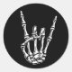 Pen & ink drawing of a skeleton hand in the heavy metal rock salute gesture. B/W graphic, on t-shirts, hoodies, buttons, stickers, cards, gifts.