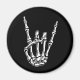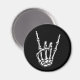 Pen & ink drawing of a skeleton hand in the heavy metal rock salute gesture. B/W graphic, on t-shirts, hoodies, buttons, stickers, cards, gifts.