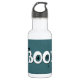 Boo! text design for Halloween with cat, spider, owl and spider net decoration on grunge blue background.