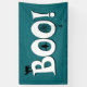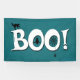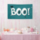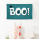 Boo! text design for Halloween with cat, spider, owl and spider net decoration on grunge blue background.