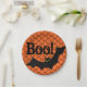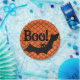 Boo! in grunge style text with black bat silhouette on orange background with chain link overlay