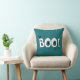 Boo! text design for Halloween with cat, spider, owl and spider net decoration on grunge blue background.