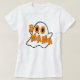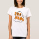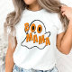 White Halloween ghost t-shirt with white ghost and orange text "boo mama". Great Halloween party / trick or treat shirt for mothers.