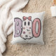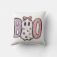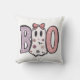 At its heart, the pillow boldly spells out "BOO" in a creative and eye-catching manner. Each letter is a work of art in itself, creating a captivating ensemble. The "B" is a soft and enchanting light purple, adorned with delicate white flowers that evoke a sense of grace and charm. The first "O" takes on the form of an adorable ghost, flanked by bats, a crescent moon, and a variety of vibrant flowers that add a playful and vibrant touch to the pillow. The second "O" is a coral pink hue, complemented by lovely white flowers and a super cute pink bow worn by the ghost, adding a touch of whimsy to the design.