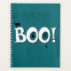Boo! text design for Halloween with cat, spider, owl and spider net decoration on blue background.