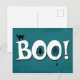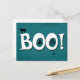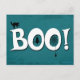 Boo! text design for Halloween with cat, spider, owl and spider net decoration on grunge blue background.