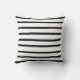 This Halloween decorative pillow features horizontal black and white stripes with an orange "boo" written in modern script placed on top.