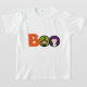 Cute and colourful Halloween T-shirts, tote bags, cards, stickers, mugs, and other Halloween apparel and gifts with a witch and frankenstein that reads BOO!