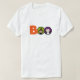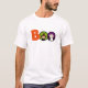 Cute and colourful Halloween T-shirts, tote bags, cards, stickers, mugs, and other Halloween apparel and gifts with a witch and frankenstein that reads BOO!