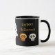 Here's a cute mug for the autumn Halloween season! It features the text "Boo Y'all" in bright yellow, with a grinning orange Jack o Lantern at the side. The other side has custom text in yellow and orange that currently says "Happy Halloween". Below the text are two grinning skulls, one in white, and one in orange. At the centre is an adorable ghost.