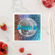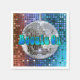 50 white paper napkins with an image of red, blue and purple disco lights, a gleaming mirrored disco ball and “Boogie On” in blue and green 70s-style lettering. See matching cloth dinner napkin, kitchen towel, cloth placemat, paper placemat and coasters. See the entire Disco 70s Napkin collection in the FOOD/BEV | Linens section.
