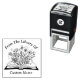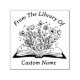 From the library of or this book belongs to rubber stamp with a drawing of a beautiful Book and flowers in the centre and your custom text and name in a vintage serif font.