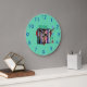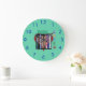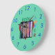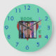 These clocks have a bright green face, slender blue numbers, and a book shelf with classic titles, a red heart and "BOOK LOVER" label.