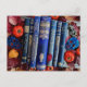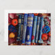 This design features antique old blue book spines, fall leaves, mini pumpkins, and blue skulls.