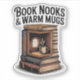A cosy, vintage-inspired design featuring a whimsical book nook nestled in a towering stack of aged books, softly glowing with warm light. A steaming mug adds a comforting touch, perfect for book lovers and tea or coffee enthusiasts. Ideal for readers who treasure cosy reading moments and bookish aesthetics.