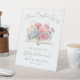 A charming welcome sign for a bridal shower inspired by the “A New Chapter Begins” theme. Centered on the sign is a watercolor illustration of an open book, accented with delicate flowers in blush pink, orange, yellow, purple, and blue, along with soft green leaves for a romantic, storybook feel.