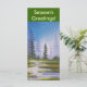 This bookmarker has an image based on an original canvas painting by Artcor7 artist. It shows a river valley with a pine forest and the expression: "Season’s Greetings!" On the back, it has an inspirational expression by the same artist as well as “Happy New Year!” on a green background.