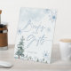 Blue winter wonderland baby shower, and bridal shower sign with pine trees and snowflakes.
