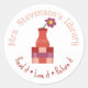 White round classroom library stickers featuring a vase with a flower on top of a stack of books . Personalise it with the teacher's name and your text .