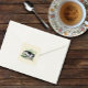 A cute black and white cat sleeping on a pile of books with a green teapot in behind and a cup of tea