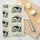 A cute black and white tuxedo cat sleeping on a pile of books with a green teapot in behind and a cup of tea in front.