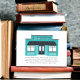 Neighbourhood "new kid in town", "new kid on the block" baby shower theme featuring blue building with "Books for baby" sign and poem.