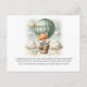 Adventure themed baby shower "Books for Baby" enclosure card with an adorable fox holding a teddy bear riding in a green hot air balloon. The watercolor green sky has white clouds with surrounding gold stars. An open book outline on front with poem on the back.
