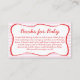 This charming Books for Baby enclosure card is designed to pair beautifully with a Ready to Pop soda-themed baby shower invitation. The card features a playful wavy frame, soft stripe background, and a pink-and-red palette that coordinates effortlessly with your “ready to pop” décor. A handwritten-style font adds a warm, personal touch—perfect for inviting guests to bring a favorite book for the baby. Ideal for including inside invitations or adding to your shower stationery set.