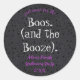 The perfect Halloween party decoration - you can put these stickers on anything! Boos and Booze Adult Halloween Cocktail Party Suite. This custom personalised sticker has a custom message over a black speckled background. Spooky typography and a black, green, and purple theme give your invited guests a fun decoration in what will surely be a spooktacular party! All text is editable - just click the personalise button to the right. Check out the matching decor items in the collection!