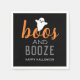 Modern and cute "Boos and Booze" Halloween party napkins feature text in orange, charcoal grey, and white lettering with a little ghost accent.