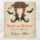 A fun idea for your Halloween Party, this wine label features a whimsical witch in striped stockings and polka dot skirt dropping into the scene with bats flying around her. Bold eerie "Boos and Booze" text is added with additional sub-text that can be personalised with your desired wording. The wine vintage is shown as "Vampire Blood". This can be edited if you wish to use other text.