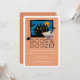 This cute "Boos & Booze" halloween party invitation card features an eyeball cocktail, bats, and spiders in front of a haunted house on orange background framed by a white border. The reverse side features orange polka dot patterns. Personalise it for your needs. You can find matching products at my store.