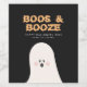 "BOOS & BOOZED" Halloween wine label featuring a cute cartoon white ghost with black background and white and orange text. Minimalist, modern and fun. All text is customisable, personalise with short greeting, year and name. Great for Halloween themed party or Halloween gift for adults.