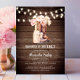 Lovely personalised rustic BOOTS and BUBBLY bridal shower invitations for that southern girl (Texas hold'em). Blush pink cream brown watercolor peonies flowers in cowboy / cowgirl boots and bubbly Champagne with flute glasses. Wood panels, brown barn colour with twinkling lights. Perfect invites for any rustic western country / south (farm) shower party theme; bachelorette theme, summer, spring or any time of year. Easy editable template cards; colour, text, font can be changed. Digital / download option. See matching items to coordinate your whole party!